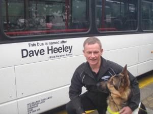 Staff at National Express West Midlands Pensnett garage named a bus after Blind Dave to honour his amazing achievements for local charities including his epic seven marathons in seven days across seven continents. Dave was recently torchbearer on the Cobridge leg of the relay. When told of the naming Dave thought it was a practical joke and did not believe it until the bus operator contacted him about launching the vehicle.Dave has raised hundreds of thousands of pounds for local charities and also visits local schools and businesses as a motivational speaker.